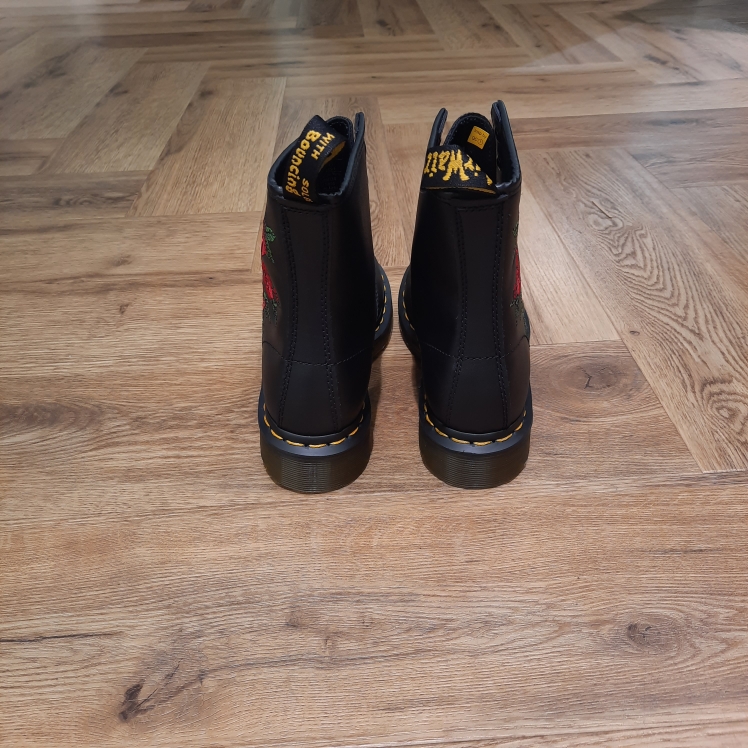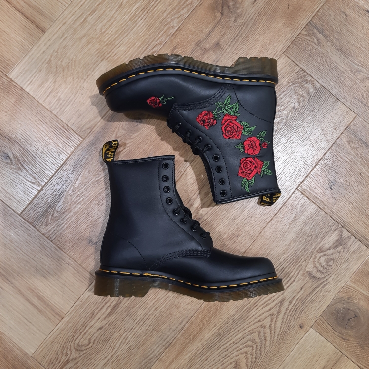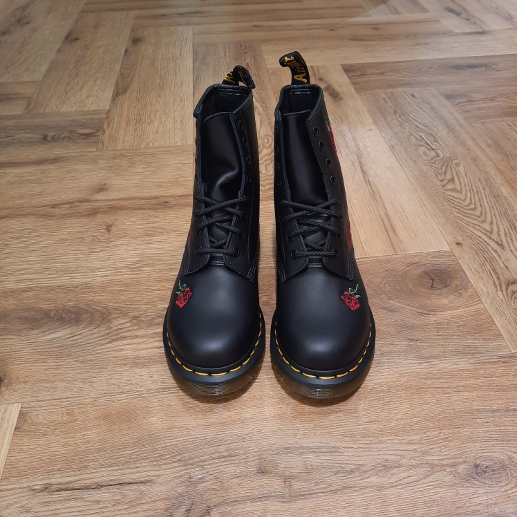 Les 1460 sont les toutes premières bottes Dr. Martens : cette version reste fidèle à l’original tout en s’inspirant de nos bottes 1914 Vonda à 14 œillets, avec un motif à roses brodé sur le côté des bottes.