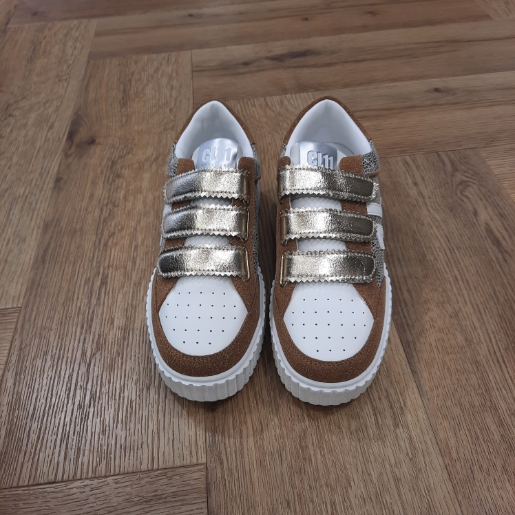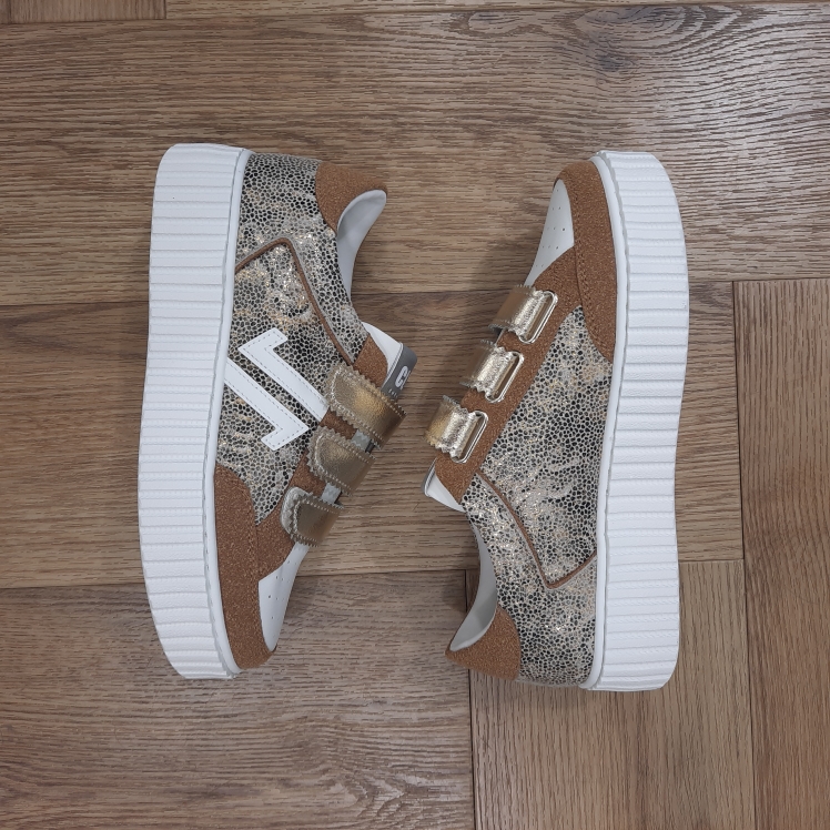 Matières secondaires : Suède Camel, Synthétique lisse blanc, métallisé doré